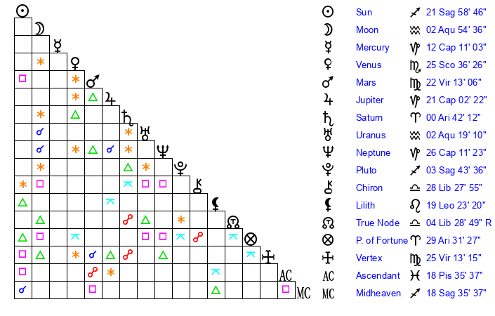 | Moon | 2 Aquarius 40 | 12 Libra 36 | 26 Aquarius 44 |