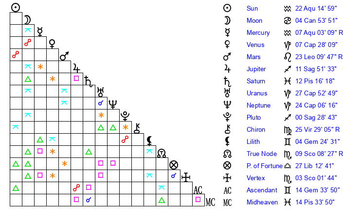 Sun | 22 Aquarius 14 | 22 Aquarius 58 | 22 Pisces 23 |