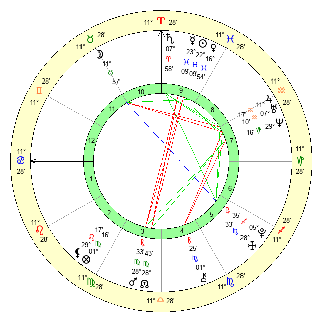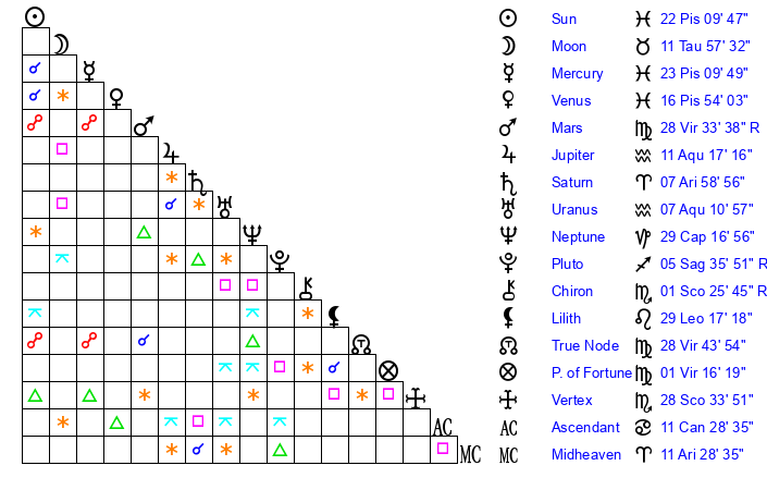 | Saturn | 7 Aries 48 | 22 Pisces 3 | 11 Aries 18 |
