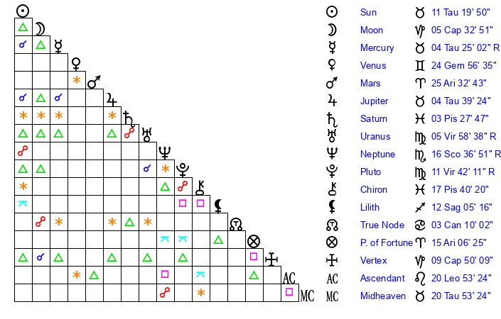 | Sun | 11 Taurus 20 | 11 Taurus 34 | 9 Cancer 51 |