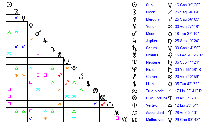 | Moon | 26 Sagittarius 37 | 27 Aries 1 | 21 Taurus 16 |