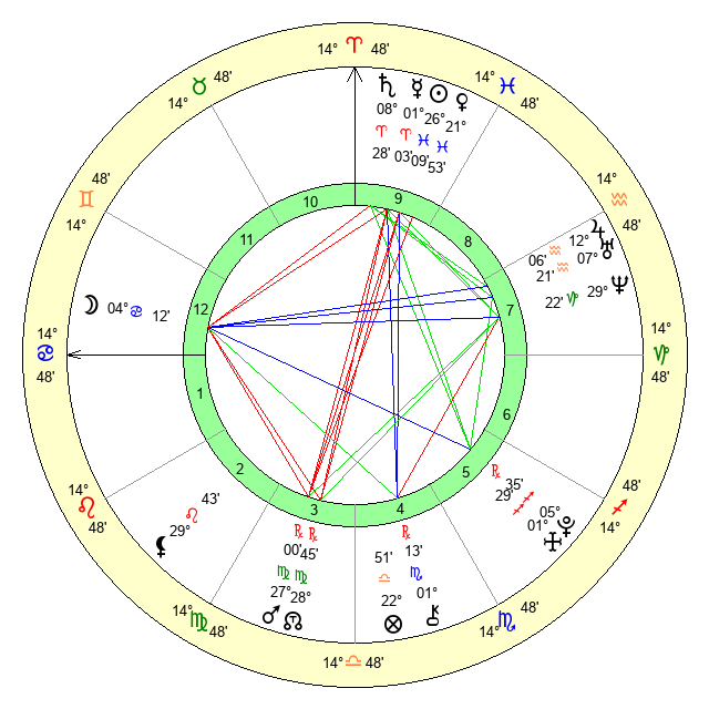 | Moon | 4 Cancer 15 | 22 Libra 44 | 12 Cancer 36 |