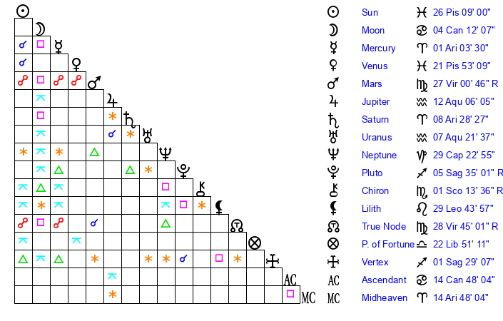 | Venus | 21 Pisces 53 | 6 Aries 30 | 26 Aries 40 |
