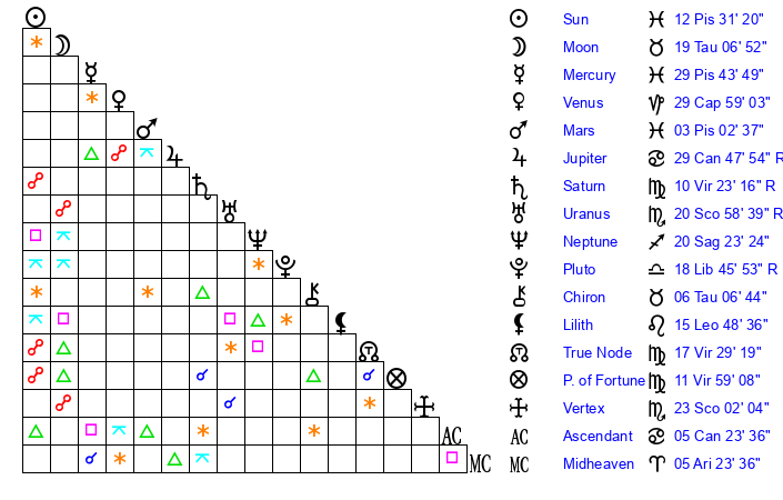 | Sun | 12 Pisces 31 | 13 Pisces 22 | 28 Aries 4 |