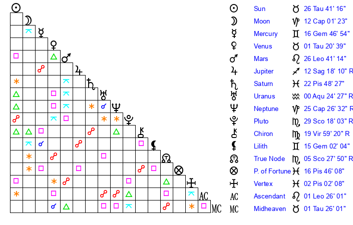 | Sun | 26 Taurus 41 | 27 Taurus 24 | 25 Gemini 26 |