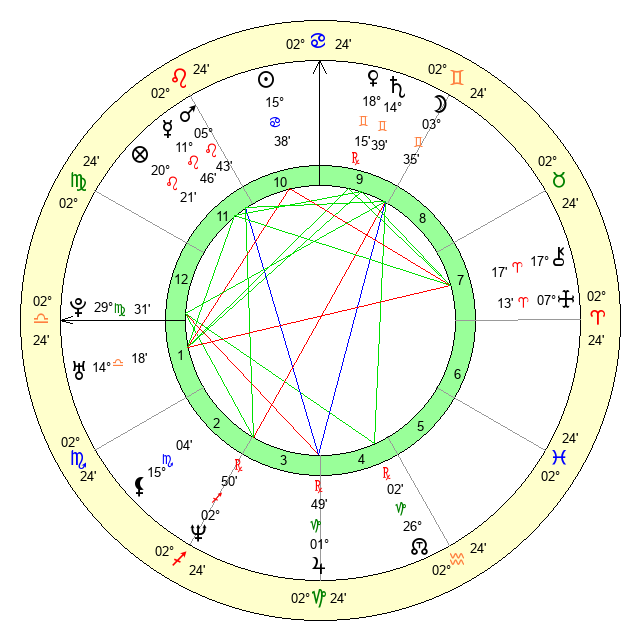 | Sun | 15 Cancer 38 | 15 Cancer 50 | 6 Virgo 26 |