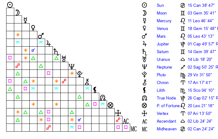 | Saturn | 14 Gemini 55 | 1 Aries 47 | 19 Gemini 50 |