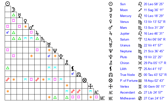 | Mercury | 10 Leo 19 | 4 Leo 49 | 12 Scorpio 30 |