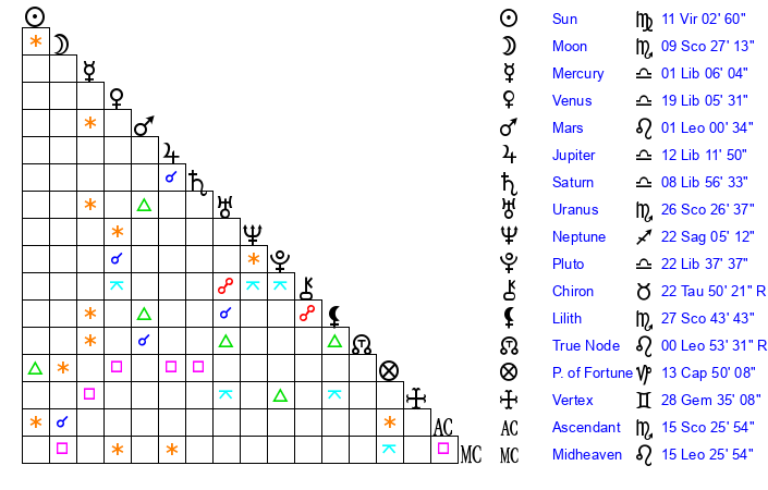 | Saturn | 9 Libra 18 | 29 Pisces 43 | 14 Libra 36 |