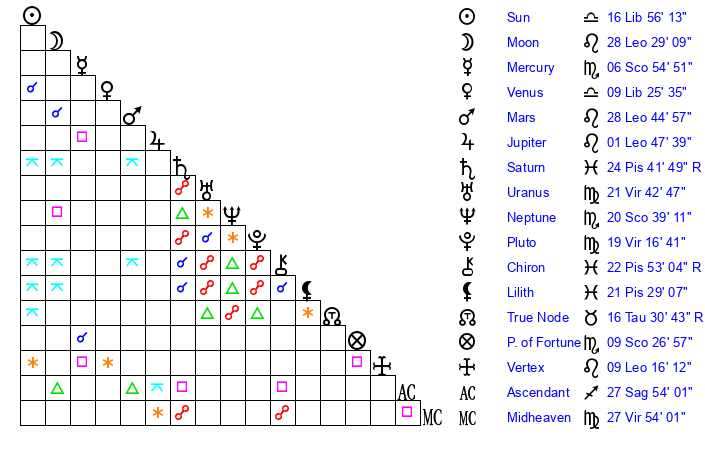 | Moon | 28 Leo 29 | 7 Gemini 2 | 1 Scorpio 38 |