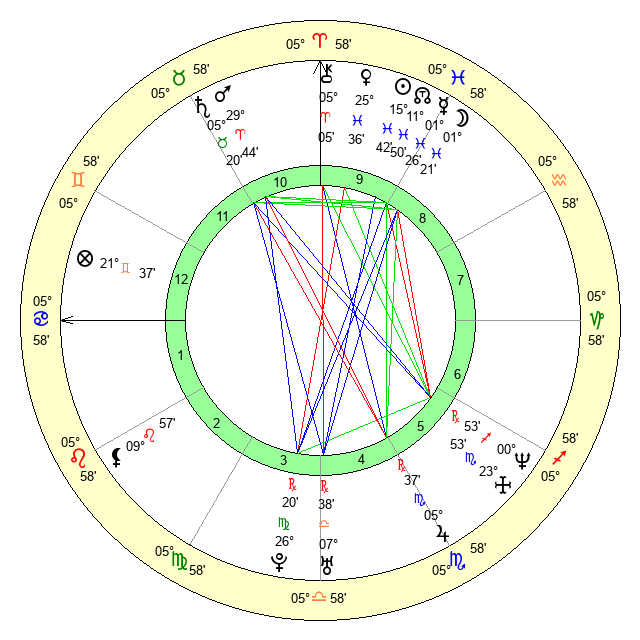 | Moon | 1 Pisces 29 | 16 Gemini 40 | 6 Pisces 9 |