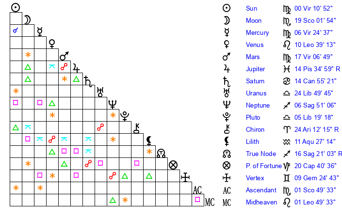 Moon | 19 Scorpio 11 | 6 Virgo 7 | 25 Virgo 36 |