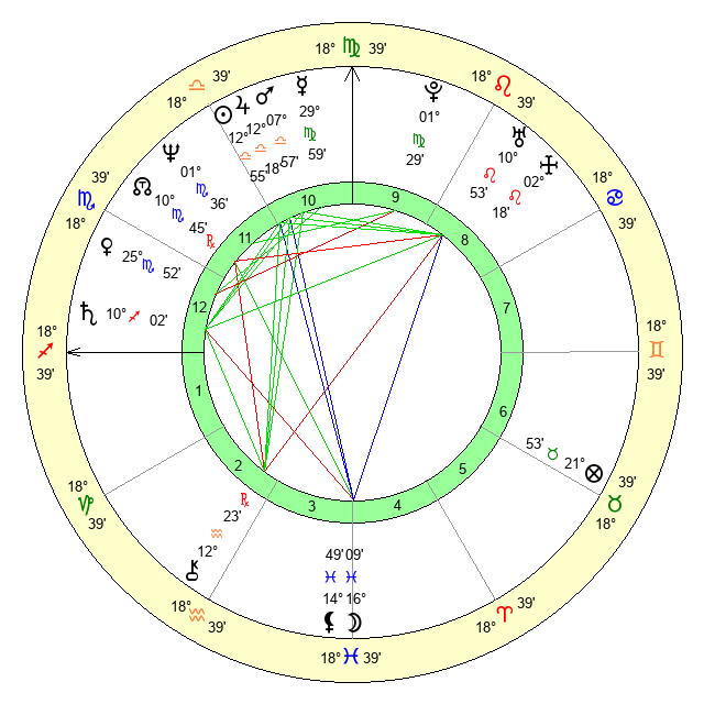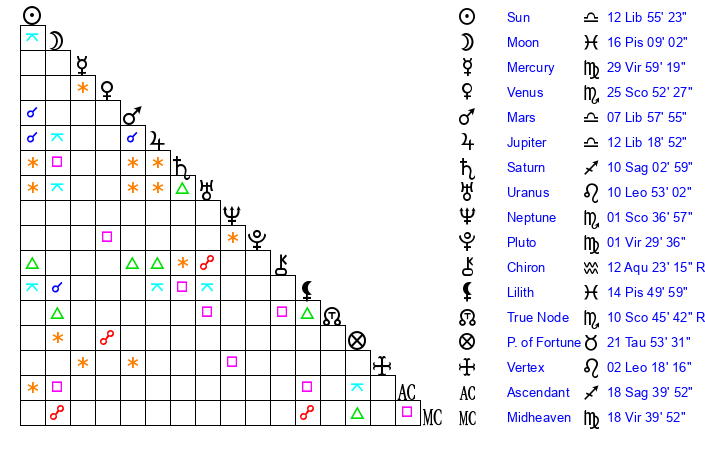 | Moon | 16 Pisces 13 | 3 Aries 43 | 10 Virgo 47 |