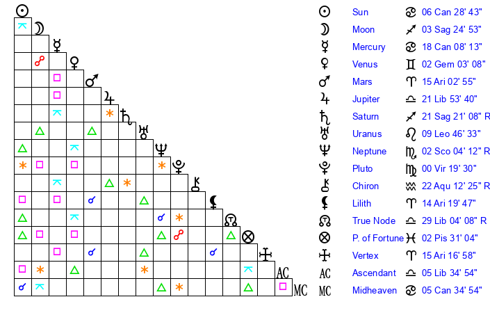 | Saturn | 21 Sagittarius 47 | 1 Aries 39 | 19 Sagittarius 35 |