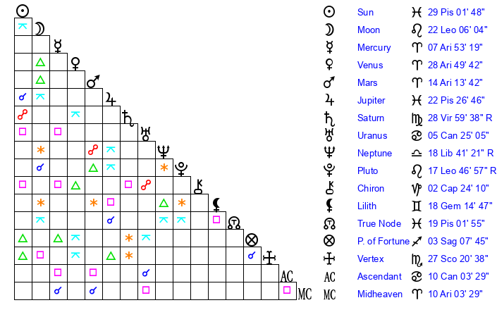 Neptune | 18 Libra 41 | 29 Pisces 37 | 16 Libra 55 |