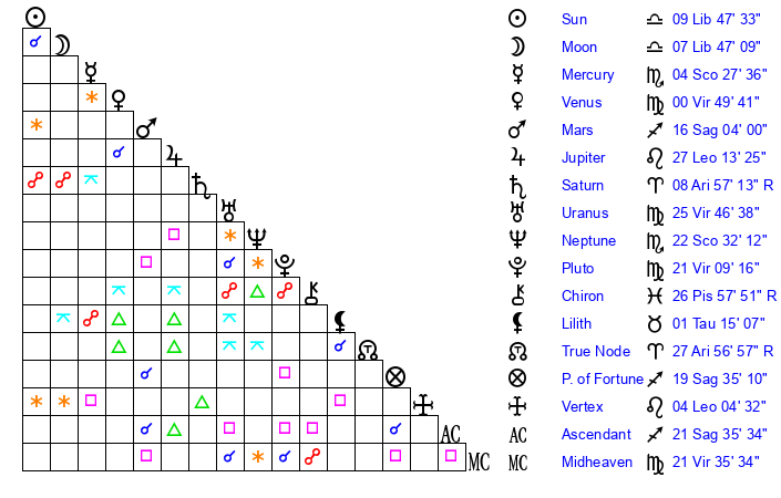 | Sun | 9 Libra 48 | 10 Libra 44 | 7 Sagittarius 48 |