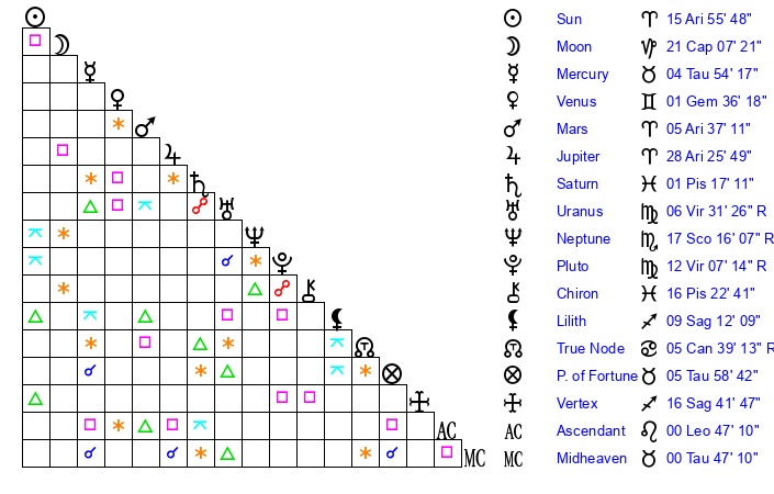 | Sun | 15 Aries 56 | 16 Aries 9 | 15 Gemini 2 |