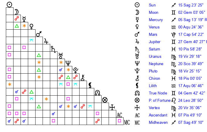 | Venus | 0 Aquarius 24 | 8 Sagittarius 38 | 0 Aquarius 20 |