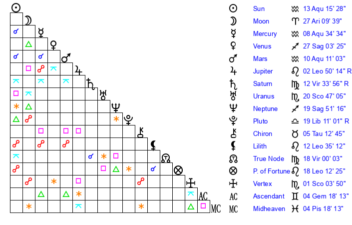 | Moon | 27 Aries 7 | 9 Aries 21 | 19 Sagittarius 43 |