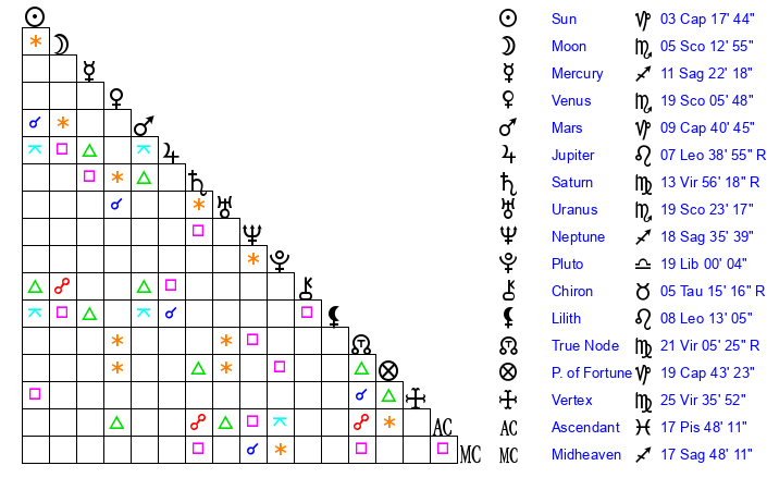 | Mars | 9 Capricorn 41 | 3 Leo 50 | 15 Aquarius 30 |