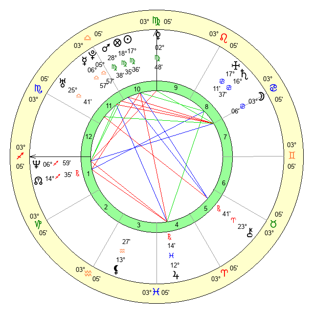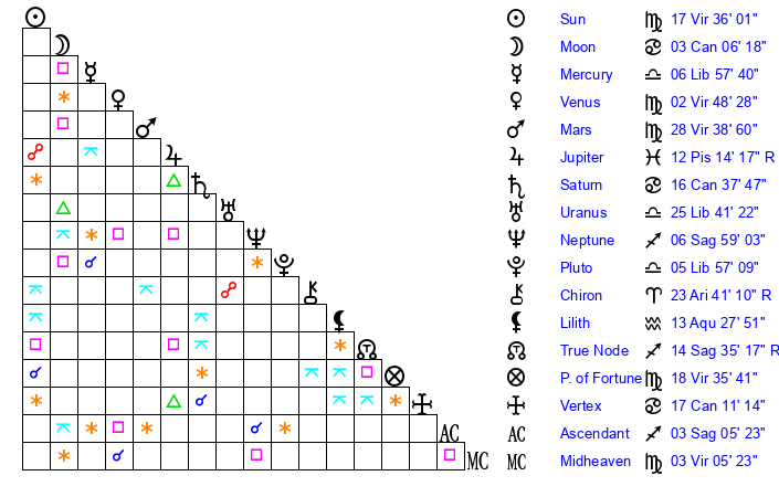 | Sun | 17 Virgo 35 | 18 Virgo 14 | 7 Scorpio 53 |