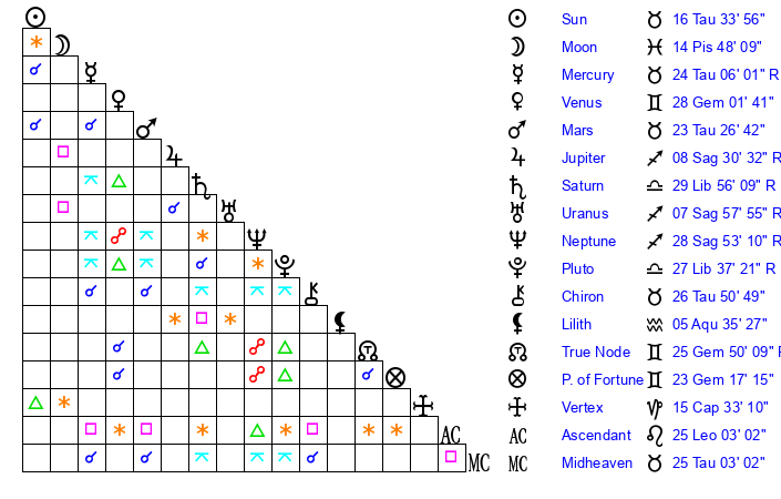| Sun | 16 Taurus 34 | 17 Taurus 23 | 26 Gemini 54 |