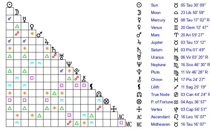 | Neptune | 16 Scorpio 45 | 0 Aries 55 | 15 Scorpio 18 |