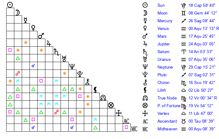 Mars | 17 Aquarius 26 | 28 Cancer 51 | 8 Pisces 43 |