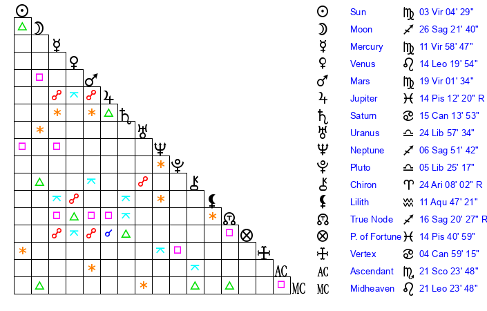 | Mercury | 11 Virgo 59 | 17 Leo 42 | 10 Scorpio 4 |