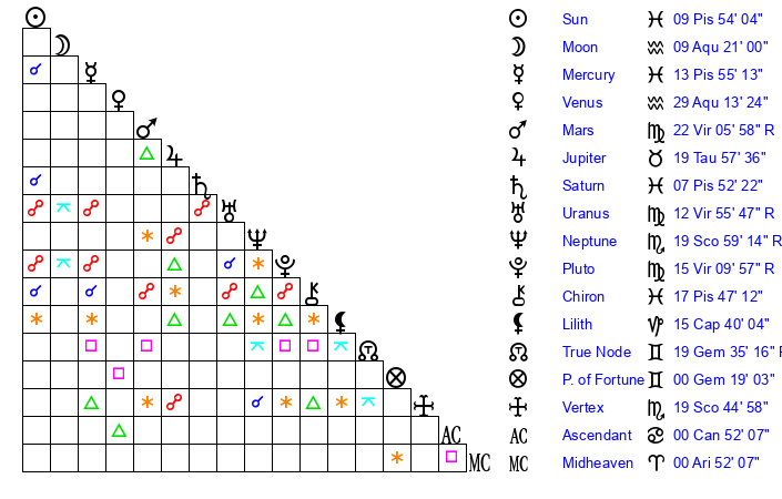 | Sun | 9 Pisces 54 | 10 Pisces 21 | 9 Taurus 10 |