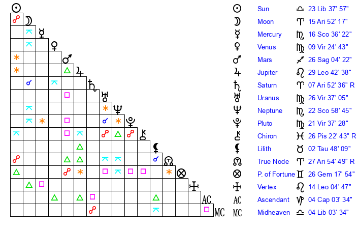 | Neptune | 22 Scorpio 59 | 0 Aries 6 | 25 Scorpio 6 |