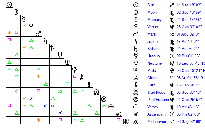 | Saturn | 24 Virgo 43 | 25 Pisces 7 | 21 Virgo 28 |