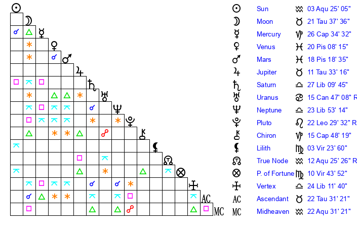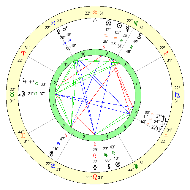| Moon | 21 Taurus 39 | 24 Scorpio 1 | 26 Sagittarius 57 |