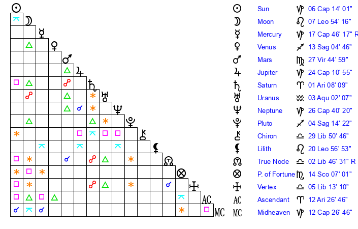 | Jupiter | 24 Capricorn 10 | 13 Gemini 41 | 0 Aquarius 43 |