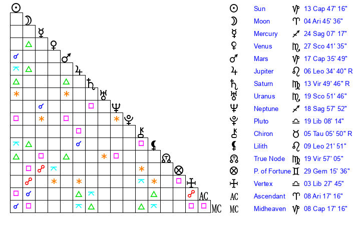 Sun | 13 Capricorn 47 | 14 Capricorn 38 | 0 Pisces 30 |