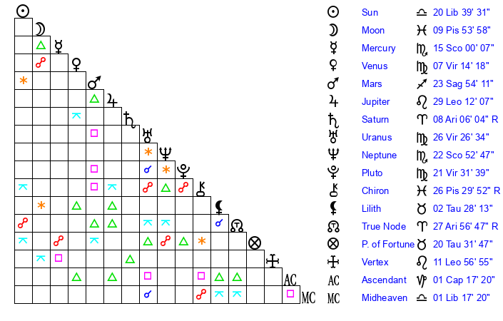 | Sun | 20 Libra 39 | 21 Libra 36 | 18 Sagittarius 58 |