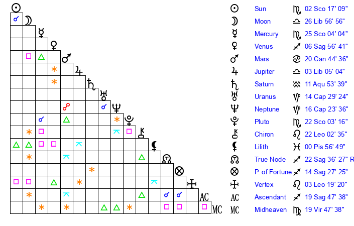 Moon | 26 Libra 55 | 15 Leo 30 | 29 Sagittarius 36 |