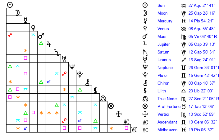 | Sun | 27 Aquarius 21 | 28 Aquarius 16 | 28 Gemini 37 |