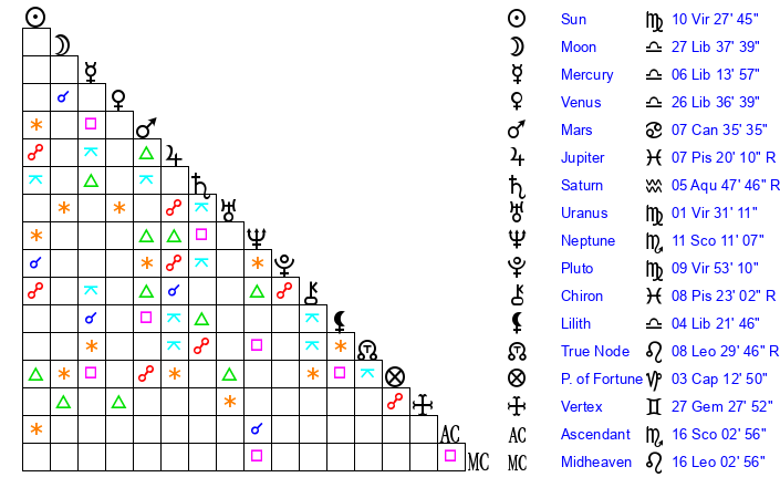 Moon | 27 Libra 41 | 17 Capricorn 18 | 14 Aquarius 33 |