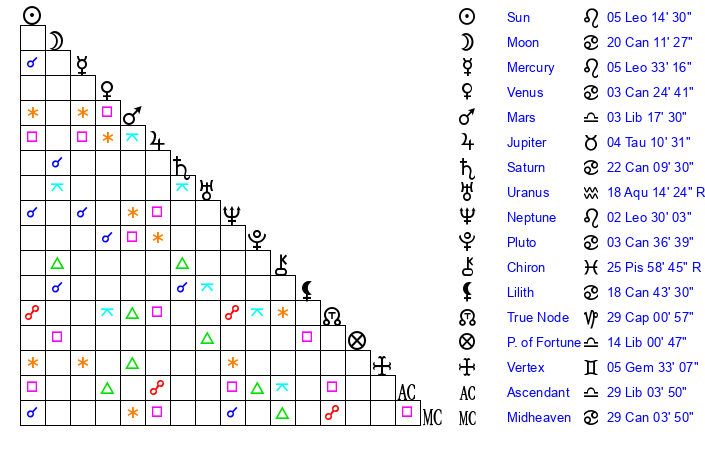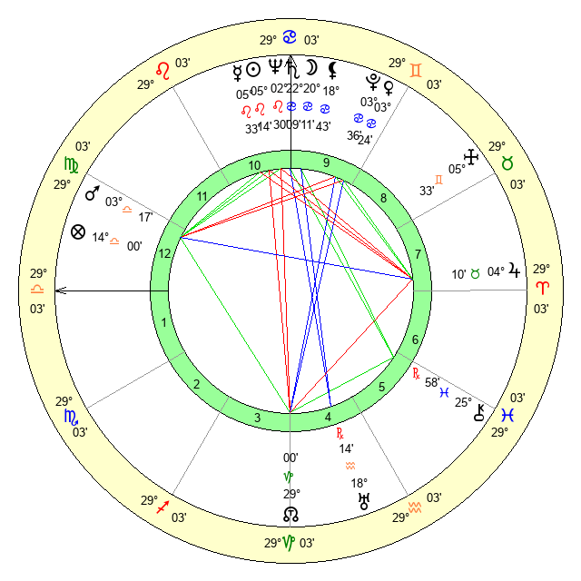 | Moon | 20 Cancer 13 | 23 Virgo 28 | 17 Cancer 20 |