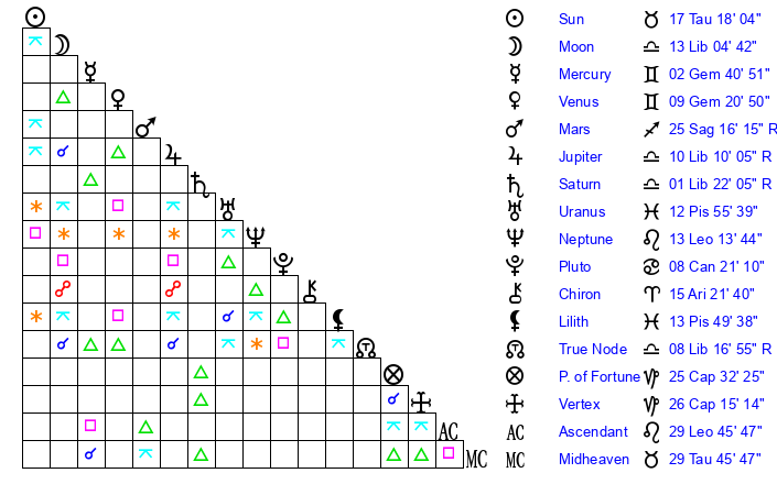 | Sun | 17 Taurus 18 | 18 Taurus 21 | 25 Leo 54 |