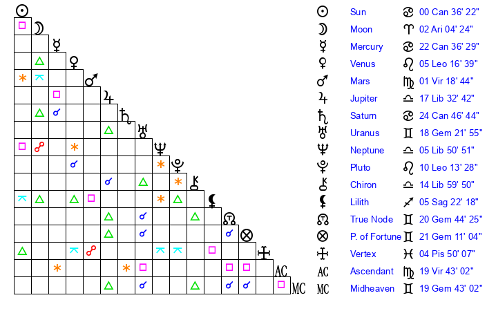 | Mercury | 22 Cancer 37 | 24 Cancer 13 | 11 Virgo 31 |