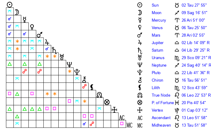 | Uranus | 29 Scorpio 13 | 25 Taurus 52 | 27 Scorpio 26 |