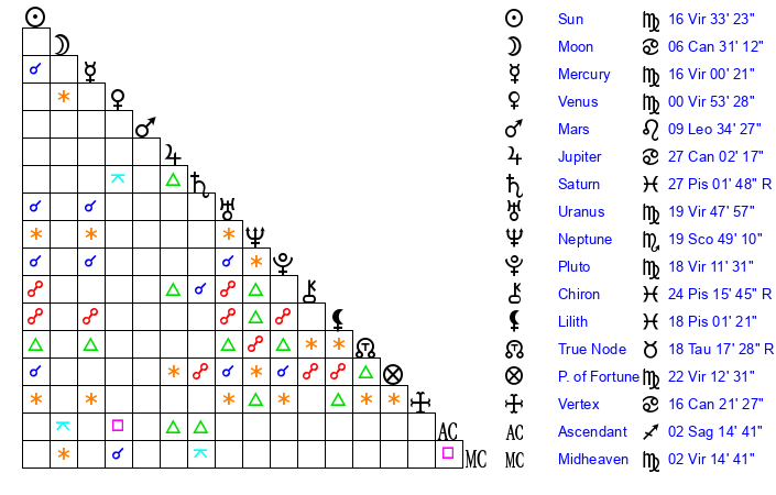 | Sun | 16 Virgo 33 | 17 Virgo 16 | 14 Scorpio 50 |