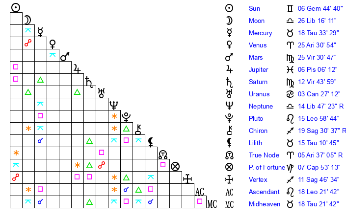 Sun | 6 Gemini 44 | 7 Gemini 34 | 18 Leo 24 |