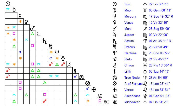 | Sun | 27 Libra 36 | 28 Libra 33 | 26 Sagittarius 5 |