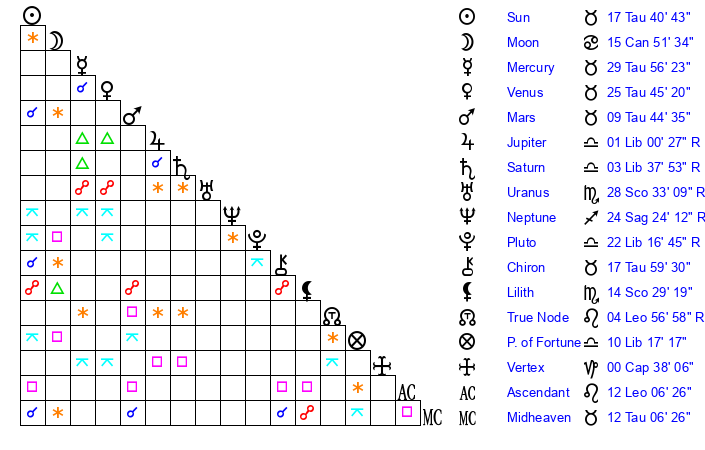 Sun | 17 Taurus 41 | 18 Taurus 2 | 29 Gemini 54 |