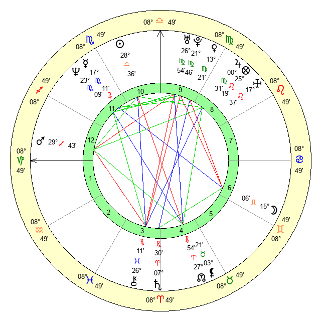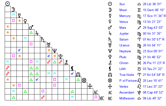| Moon | 15 Gemini 6 | 12 Scorpio 33 | 28 Cancer 45 |
