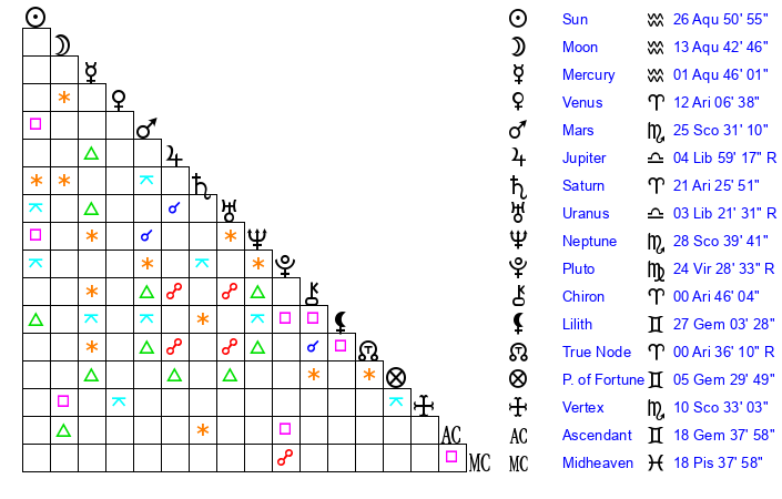 | Moon | 13 Aquarius 48 | 2 Libra 31 | 2 Pisces 59 |