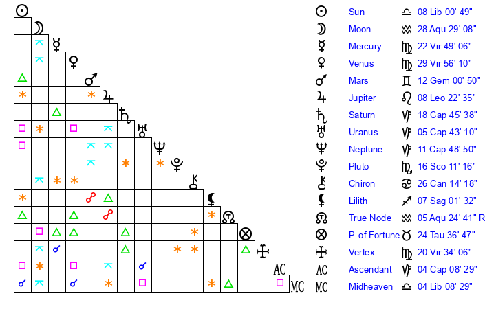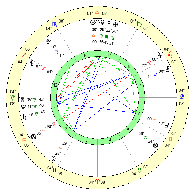 Sun | 8 Libra 0 | 8 Libra 31 | 12 Scorpio 46 |